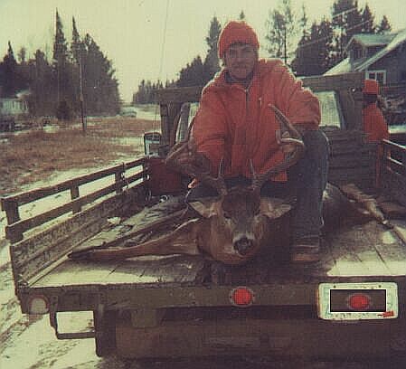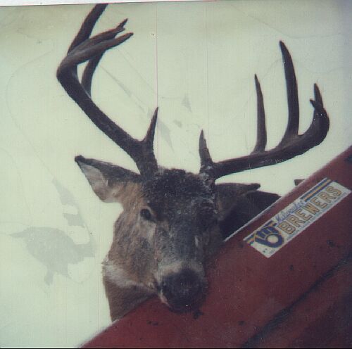Chucky scored big time with this dandy 10 pointer behind the farm. After many many frustrating attempts it was decided to run the drive backwards and it worked like a charm. This monster tried to low crawl on it's belly to get around Chuck but was nailed when he bolted. This picture was taken by Mike Temke on the back of Leon's truck at the Red Arrow in Cavour.