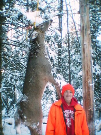 The word around town was that the deer were all up in the hardwoods so that was the plan for day two. More flaky stuff and 20 degrees dampened the crack of dawn enthusiasm except for Manly who braved the elements and just ended up cold. Actually it was a good thing because the poker game broke up at 3 am with Mike enough ahead to buy a tank of fuel. Temke et al had made the Argonne run with results best left undisclosed. ("Don't bet on it!") Suffice to say the day ended at noon with the Packer game at Lloyds, after Scott passed on a T-zone deer walking at 35 yards. The hard core hunters hit the woods again after the game and it paid off for Travis who brought home a great 5 pointer to hang on the pole. J.C. did it again with a nubbin buck off the shack road on the way in.